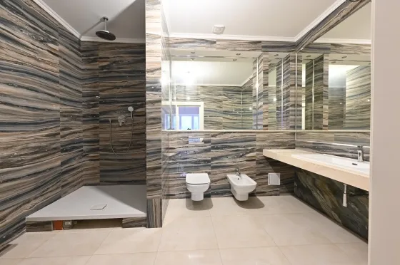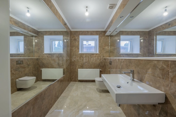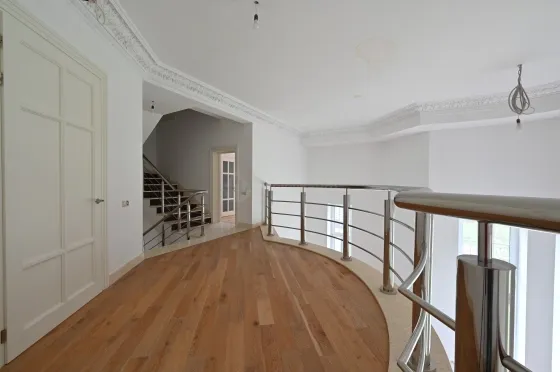 Планировка:1 этаж: большая прихожая, просторная гостиная со вторым светом и большими арочными окнами, каминный зал, столовая, кухня, гостевой санузел, гостевая спальня с санузлом, постирочная, два выхода на террасы, гараж на 5 автомобилей. 2 этаж: четыре спальни со своими гардеробными и санузлами, выход на балкон-терассы. Мансардный этаж: спальня, помещение свободного назначения, где можно устраивать театральные постановки. Цокольный этаж: предусмотрен спа-центр, бойлерная, помещение свободного назначения. Участок правильной формы, огорожен, по периметру растут взрослые сосны. Перед домом парковка на несколько автомобилей.
