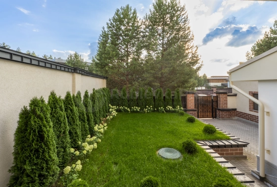 Две террасы и два ухоженных зеленых участка: небольшой участок перед входом в дом и основной участок с выходом в лес, где может отдыхать вся большая дружная семья.