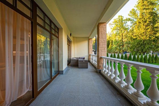 На втором этаже расположены большая гардеробная комната, спальня с выходом на большой балкон, где с утра, попивая чашку кофе наслаждаешься тишиной, которую прерывает пение птиц. В спальне свой санузел.