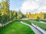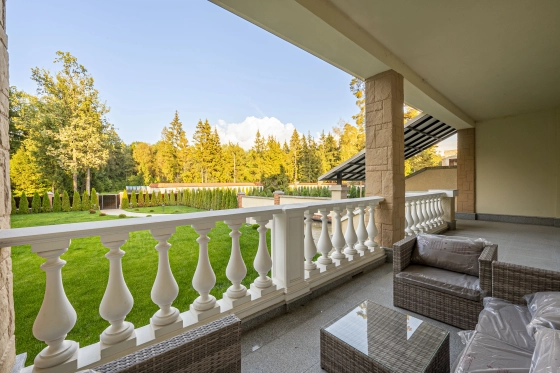 Столовая с панорамными окна и с выходом на террасу, где можно также расположиться на свежем воздух в уютной компании близких и друзей. И наблюдать собственный светлый зеленый участок, с уже установленным автомолитом, посаженными взрослыми деревьями. а также наблюдать лес и дышать чистейшим воздухом, и при желании всегда можно выйти и погулять по лесу, заниматься на спортивной площадке, расположенной под сенью вековых елей.