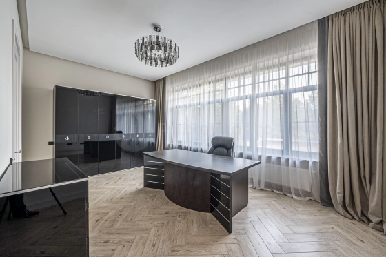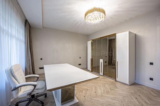 Далее попадаешь в мастер-блок, в котором огромная спальня, гардеробная комната, санузел и собственный кабинет с выходом на балкон. В кабинете ничего н будет отвлекать от работы, только чистый свежий воздух и щебетанье птиц.