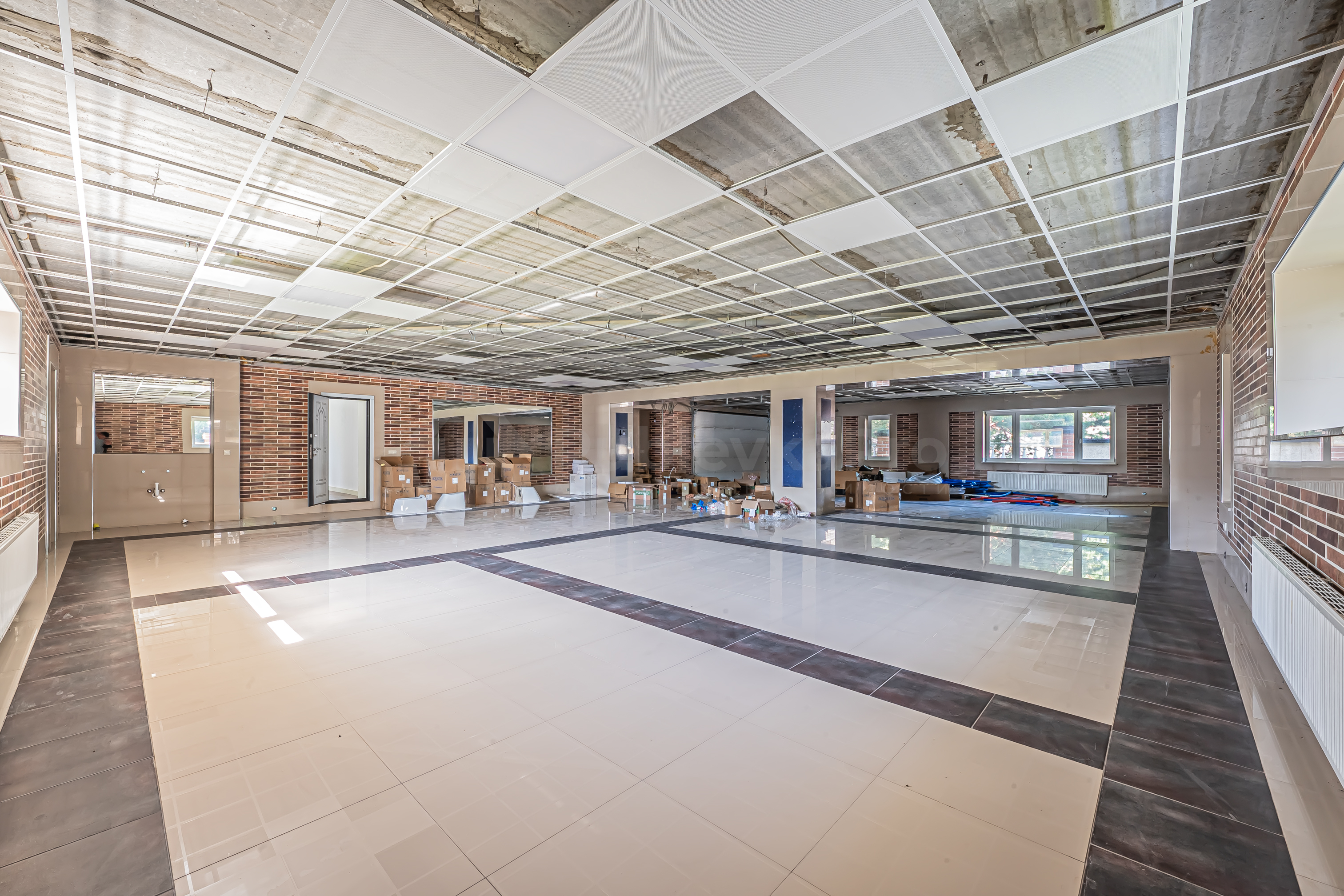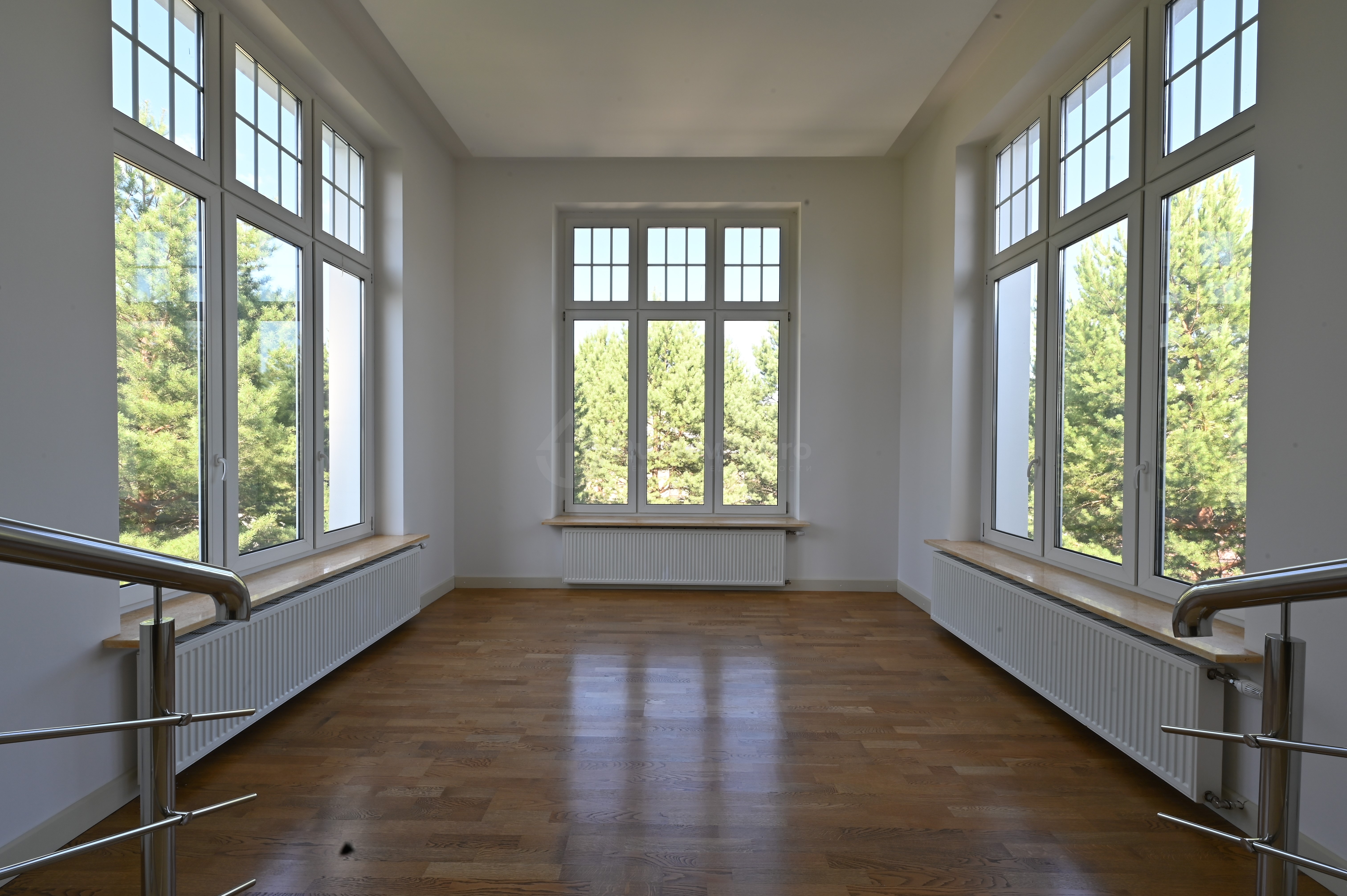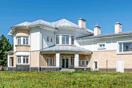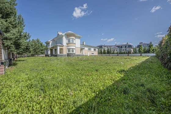 В доме большая гостиная со вторым светом и выходом на террасу, каминная, кухня-столовая, большая прихожая. Также на первом этаже расположен гостевой санузел, гостевая комната /комната персонала с кухней и санузлом, постирочная, газовая котельная с современным газовым котлом, гараж на 6 автомобилей.