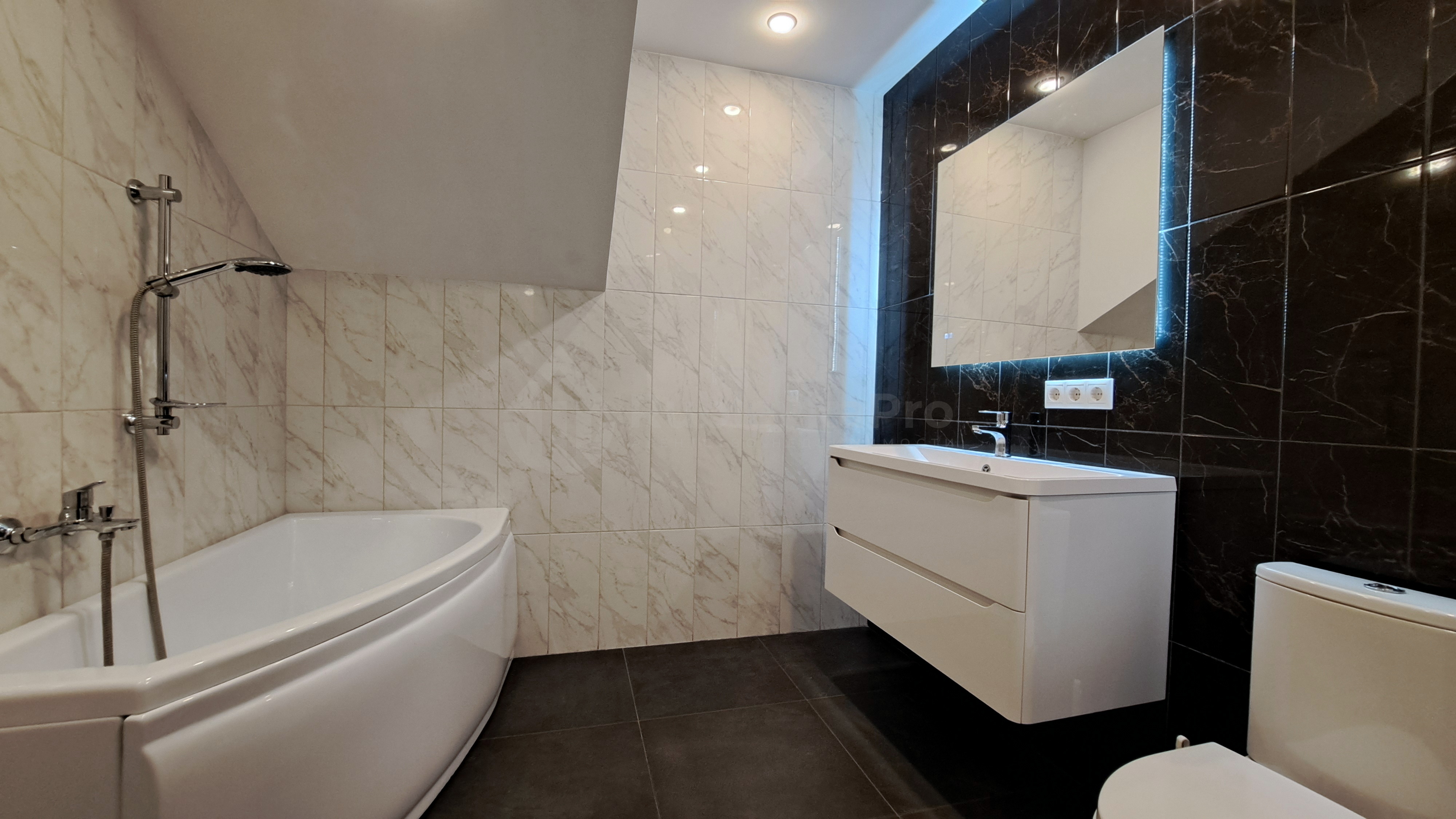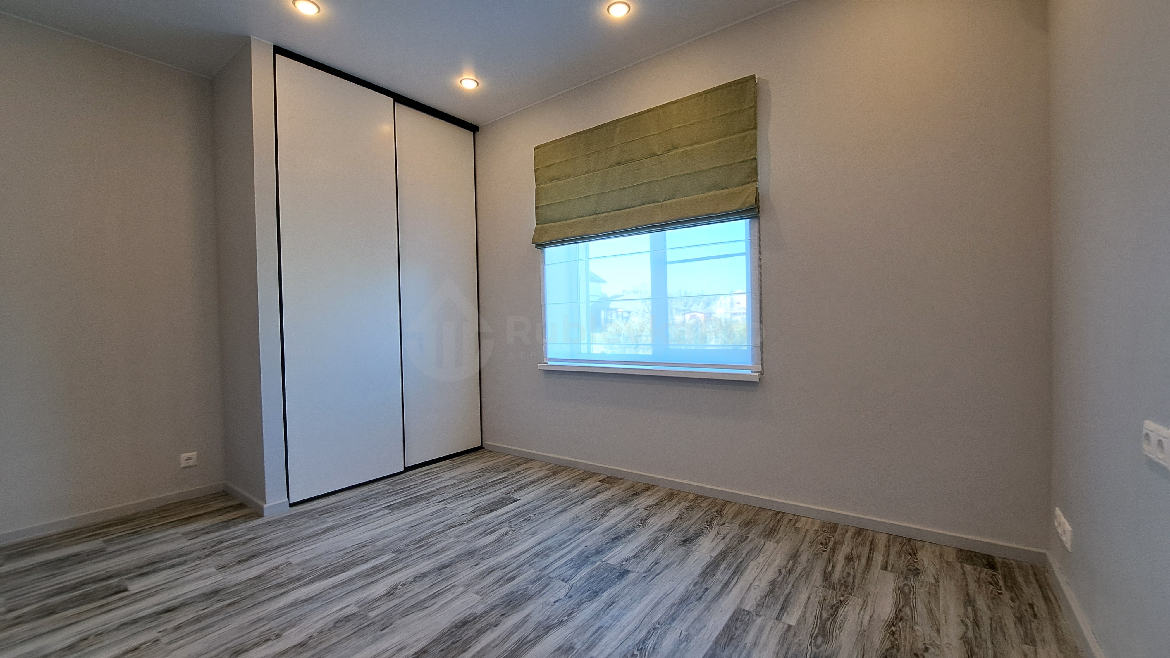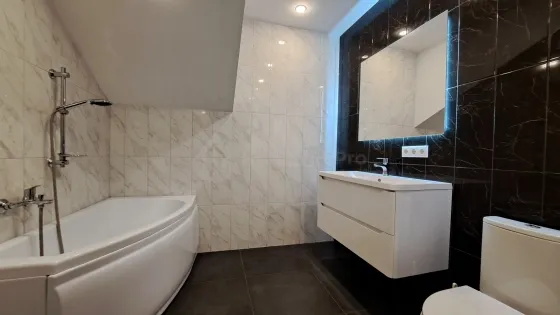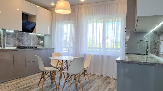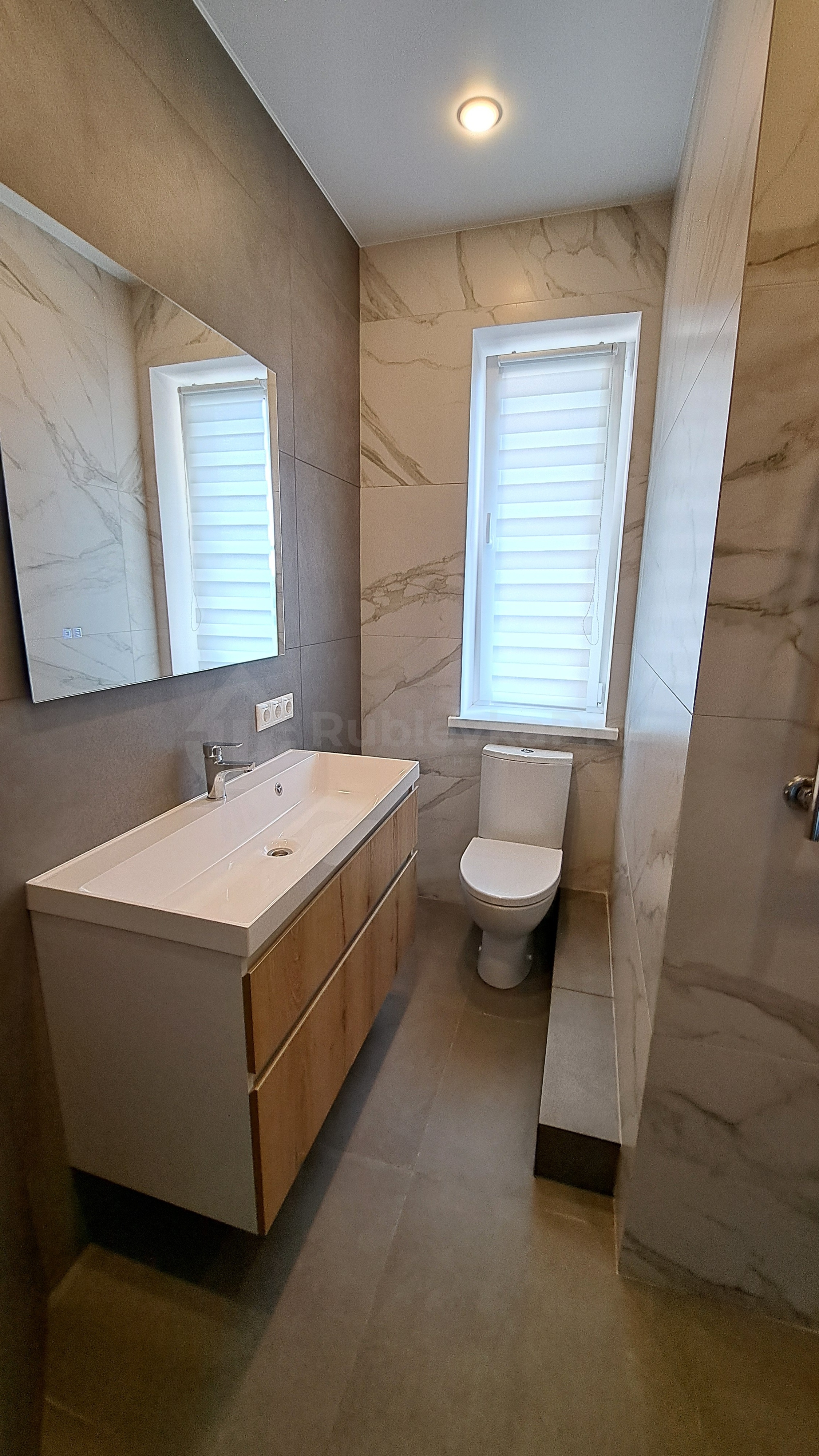 В доме на первом этаже просторная светлая гостиная, полноценная кухня-столовая с выходом на террасу, гостевая спальня, кладовая, гостевой санузел с ванной, светлая прихожая, бойлерная, гараж на 2 автомобиля.