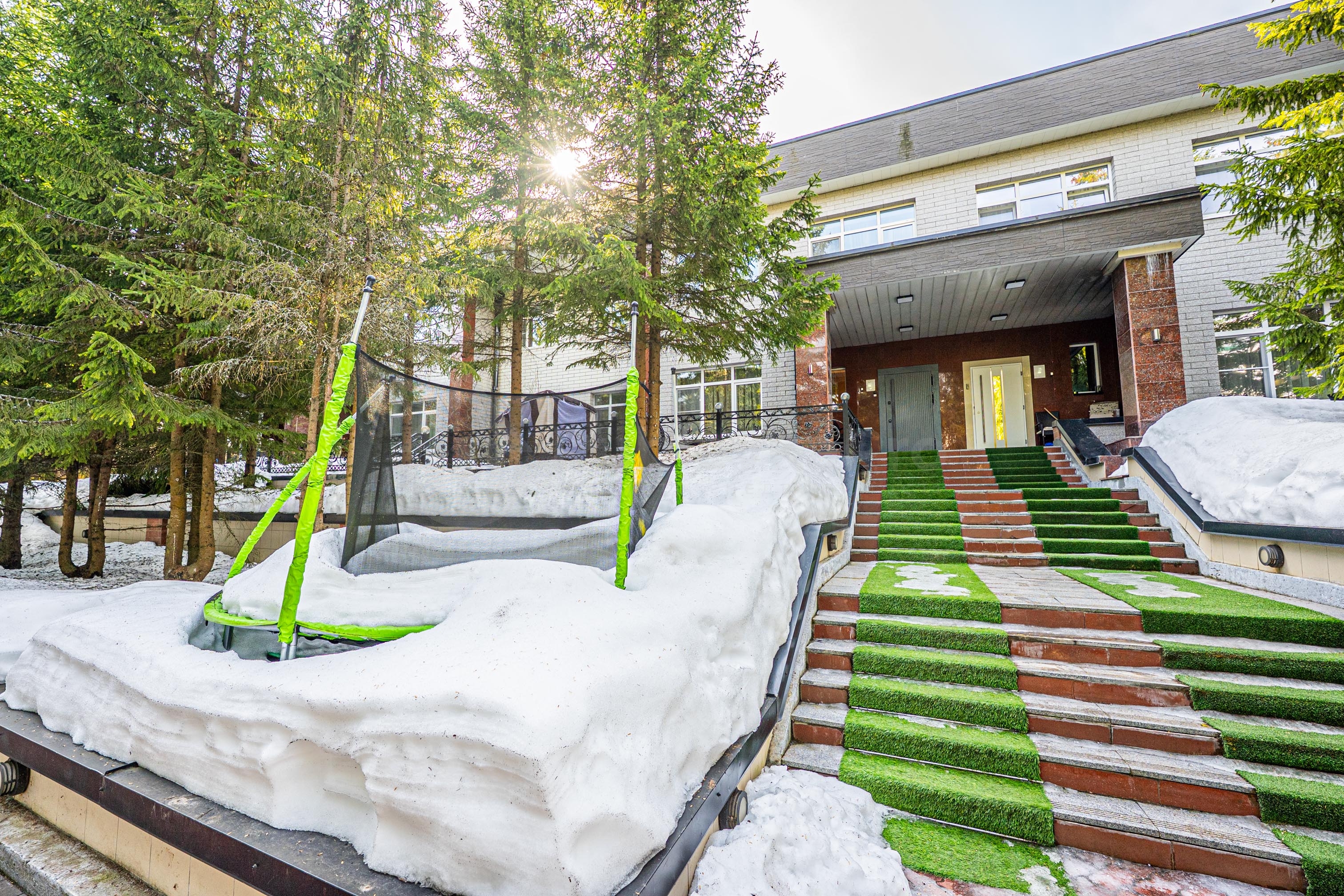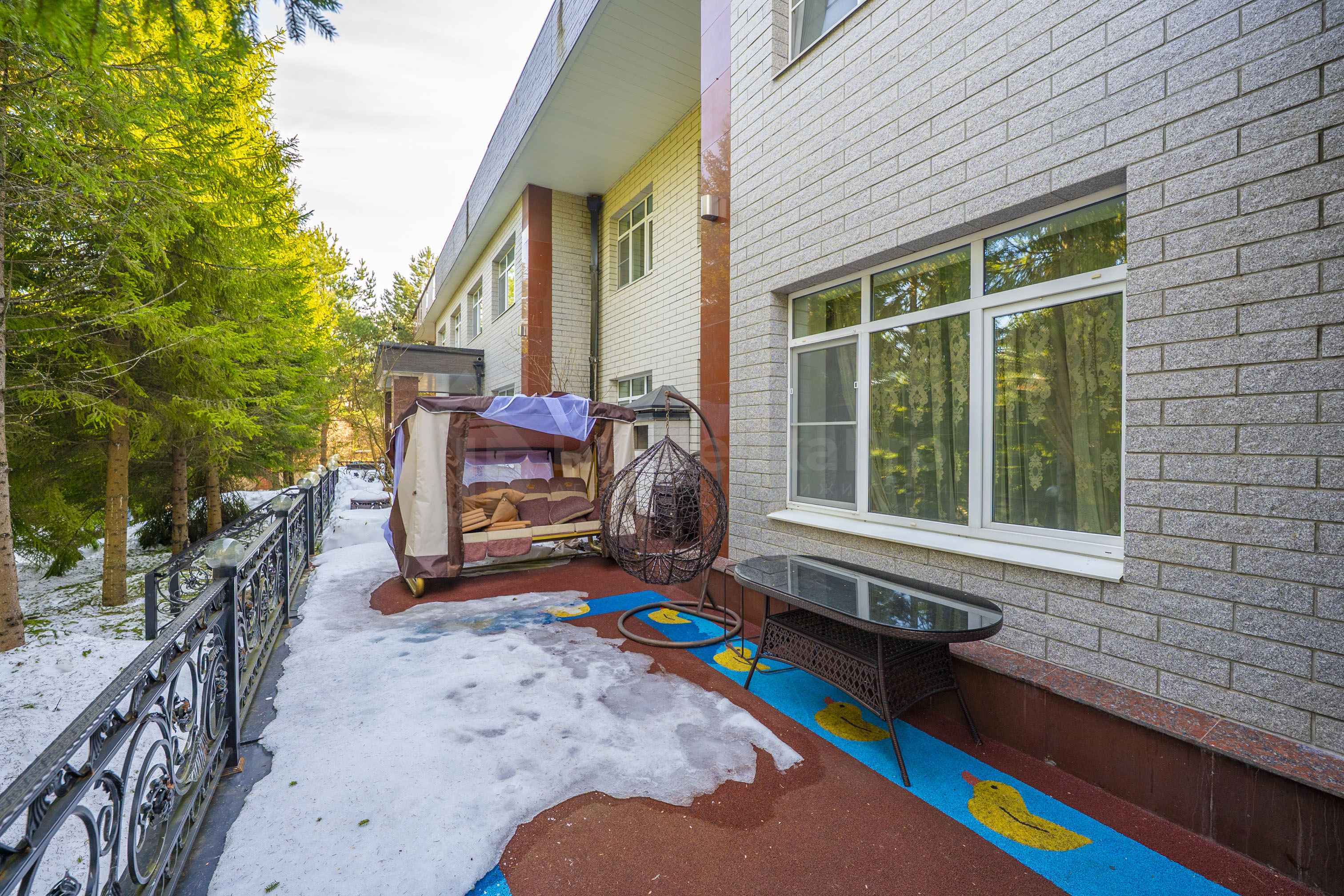 Перед таунхаусом небольшая площадка на открытом воздухе, на которой размещены уличные качели, уличная мебель, детский батут. Возможно поставить газовый мангал.