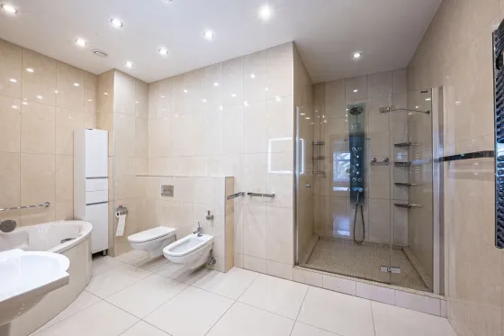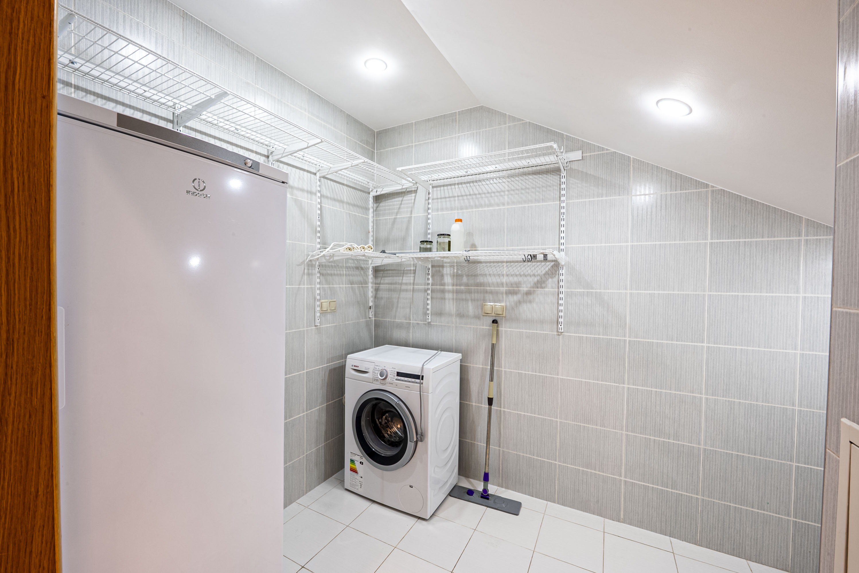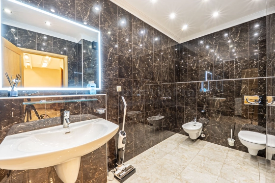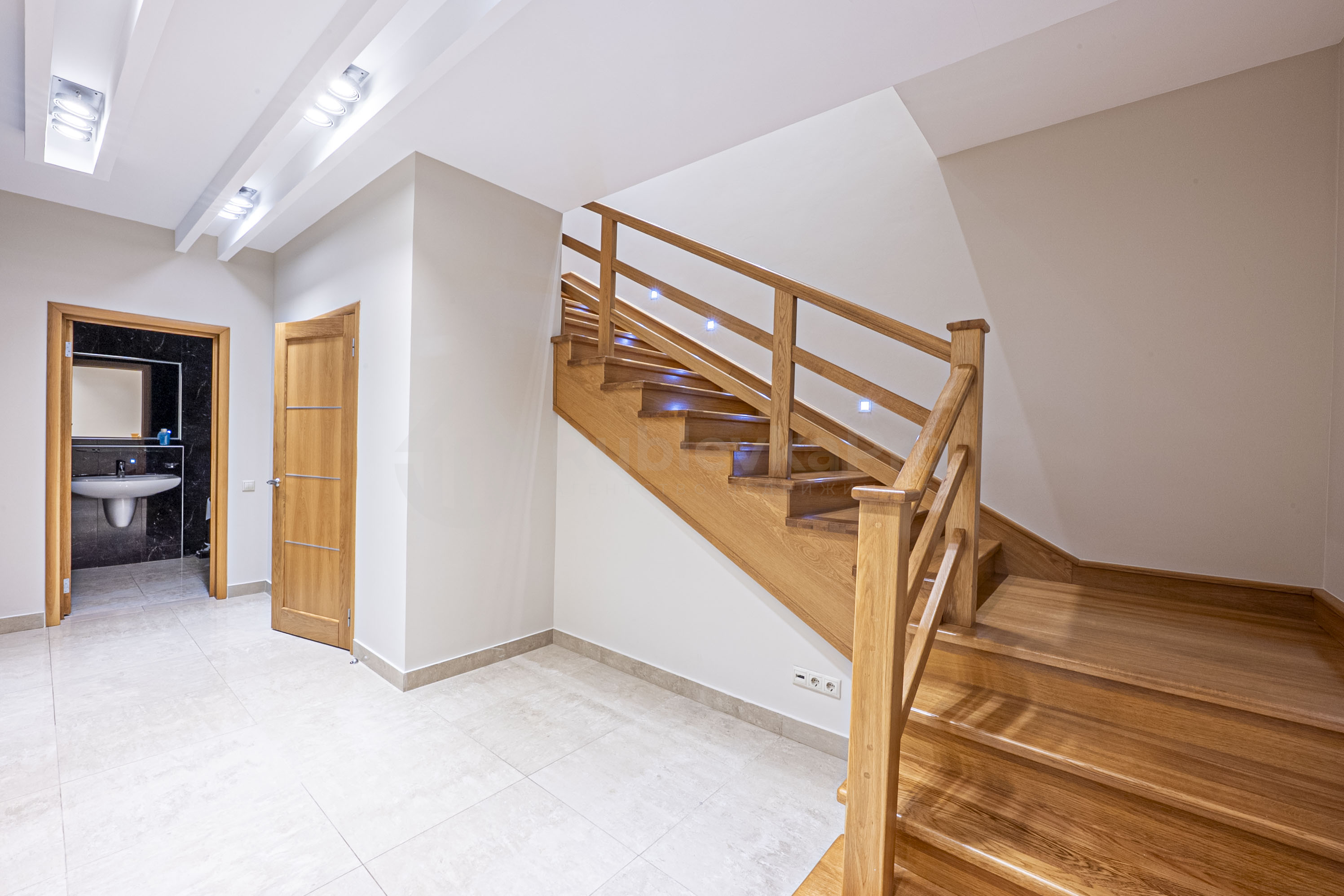 На второй этаж попадаешь по красивой дубовой лестнице с подсветкой. На втором этаже две просторные спальни со своими санузлами, установлены ванны и душевая кабина. Четвертая комната свободного назначения, возможно сделать кабинет, или дополнительную третью спальню.