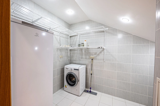 На первом этаже просторная светлая гостиная -столовая-кухня, гостевой санузел, гардеробная, постирочная комната, спуск в паркинг.