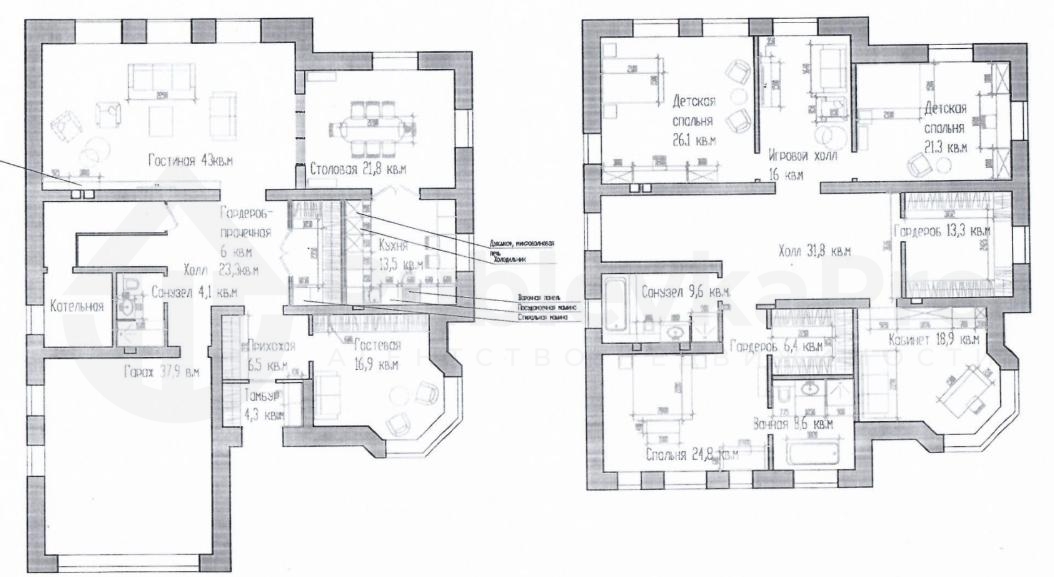 На втором этаже расположены мастер-спальня со своим санузлом и гардеробной комнатой, две детские комнаты с игровым холлом, кабинет/спальня, гардеробная комната, санузел.