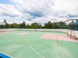 На светлом участке газон, установлена площадка под барбекю, футбольные ворота.