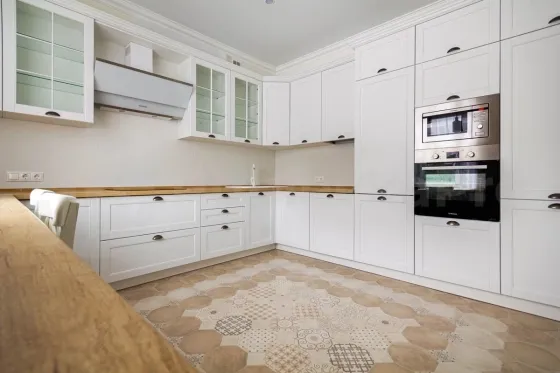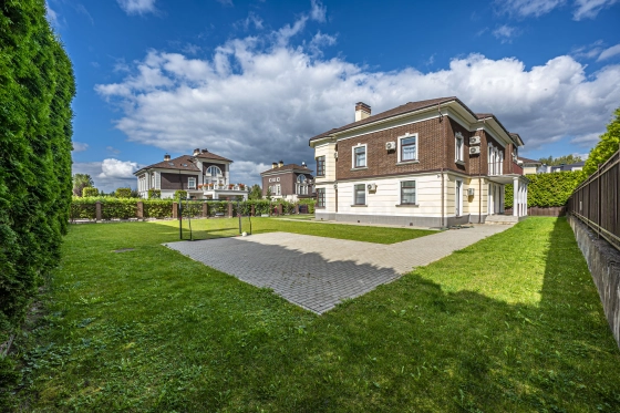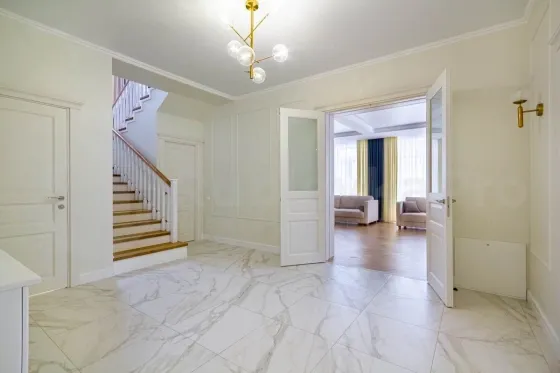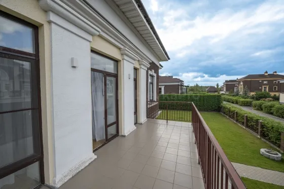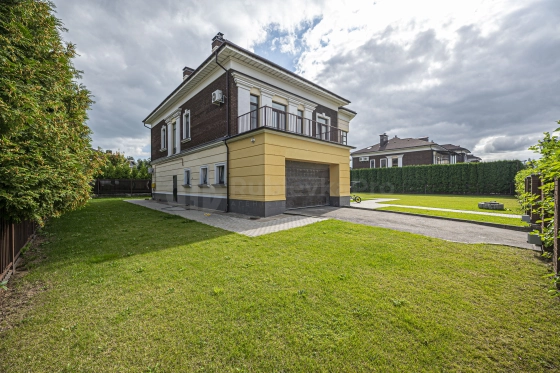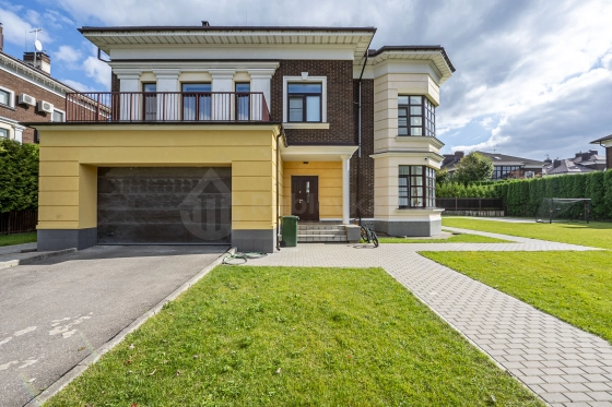 Продам светлый дом 354,1 м2 на зеленом участке 13 сот.. В доме большая гостиная -столовая с выходом на террасу и участок, кухня, оборудованная всей необходимой техникой западных брендов, гостевая спальня, гардеробная комната, гостевой санузел, бойлерная., гараж на два автомобиля. Перед гаражом есть также парковка на два автомобиля.