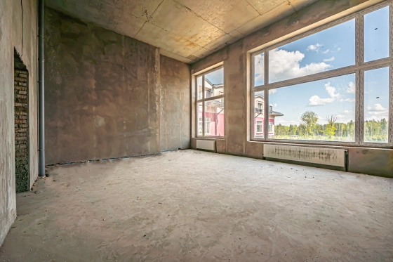 - Первый уровень: кухня-гостиная 58 м², спальня, с потолками более 6 метров, два санузла.