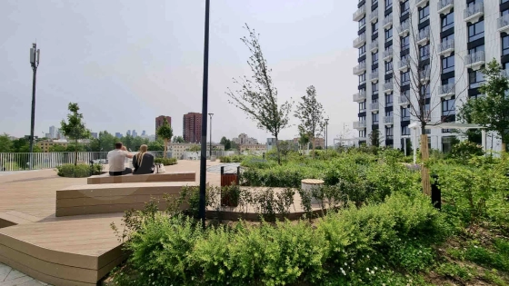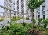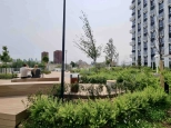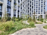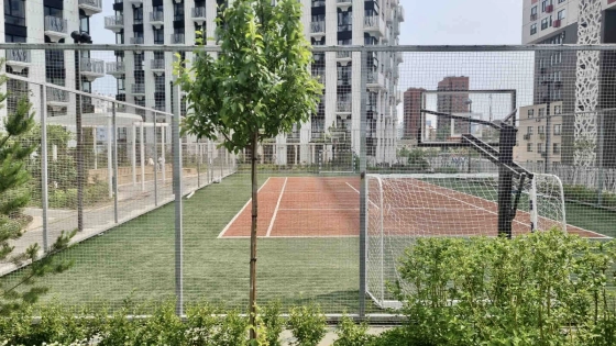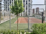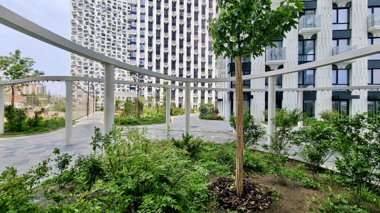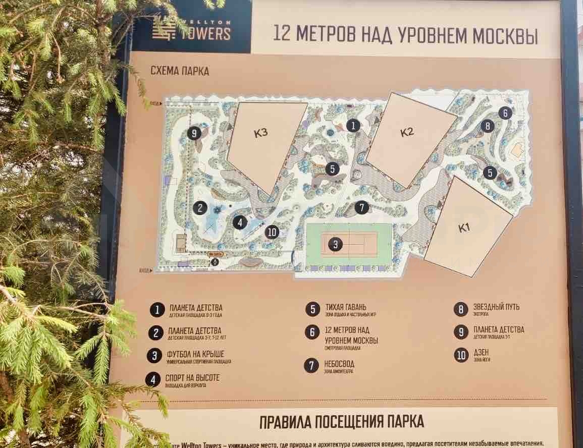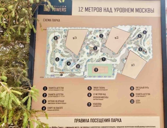 приватный парк на крыше стилобата (12 метров над землёй) с теннисным кортом, спортивными и детскими площадками, ландшафтным дизайном;